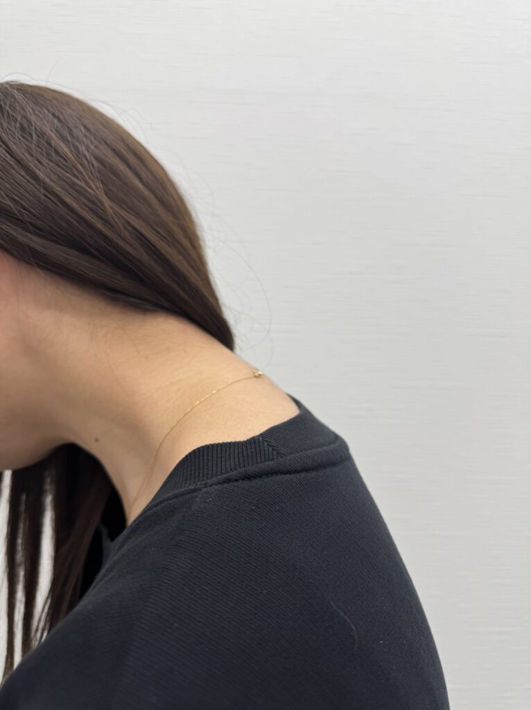 この位置に戻るだけで、首の後ろに溜まっていた余計な力が抜け、自然と首元が長く、すっきりと見えてきます。結果として、フェイスラインやデコルテまで軽やかな印象に!